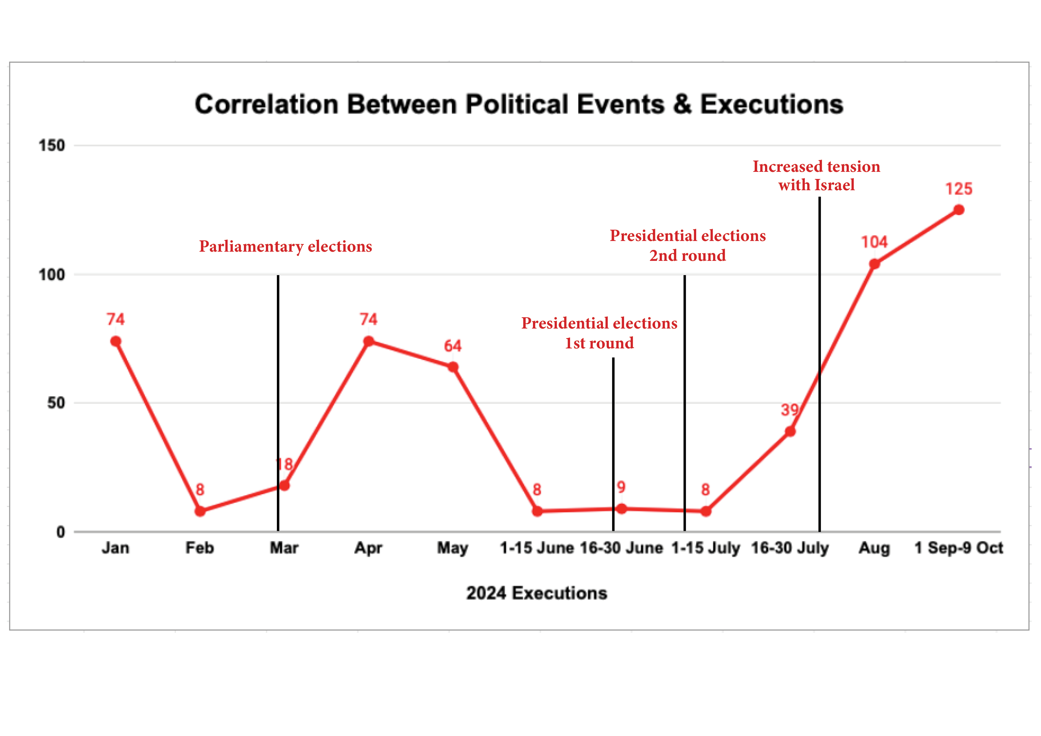 Le nombre d’exécutions diminue généralement à l’approche des élections afin d’encourager les gens à se rendre aux urnes. Comme le montre le graphique ci-dessous, bien que les élections législatives et présidentielles aient eu lieu en 2024, le nombre total d’exécutions est actuellement similaire à celui de 2023, qui n’était pas une année d’élections.