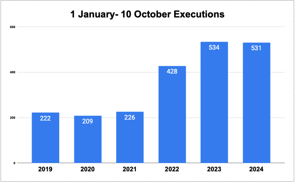 Les exécutions enregistrées entre le 1er janvier et le 10 octobre 2024 sont à un taux similaire (réduction de 0,5 %) à celui de 2023, année au cours de laquelle 534 exécutions ont été enregistrées au cours de la même période. 428 exécutions ont été enregistrées au cours de la même période en 2022, 226 en 2021 et 209 en 2020.